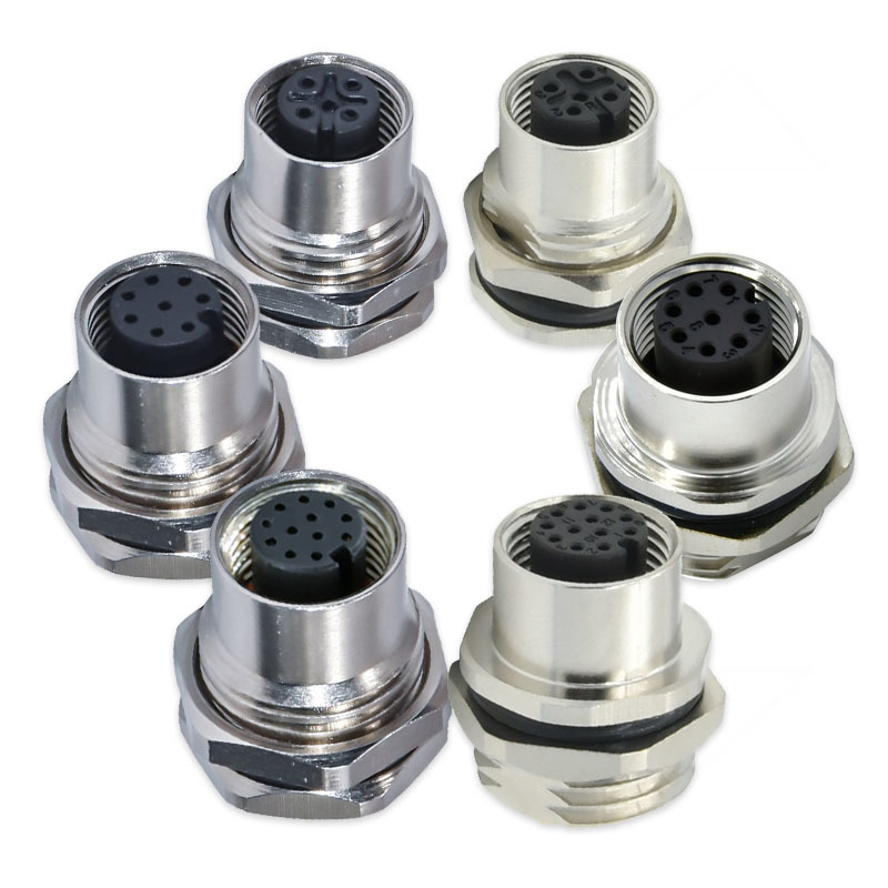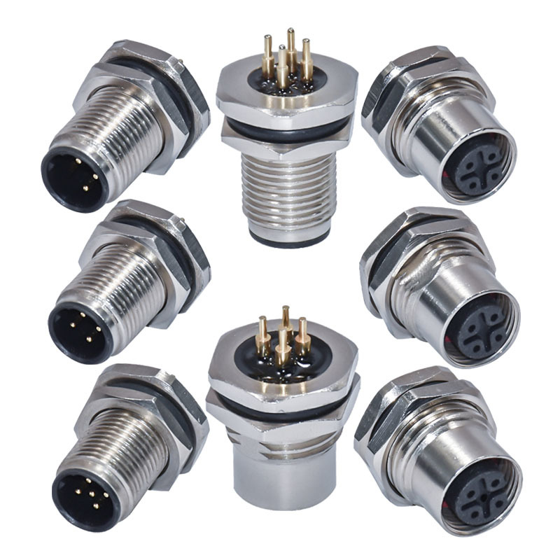 Connettore M12 di alta qualità con configurazione a 90 gradi, disponibile in diverse configurazioni di pin (3, 4, 5, 8, 12, 17 pin) per applicazioni con sensori PCB. Adatto sia per connessioni maschio che femmina in ambienti automobilistici e industriali.